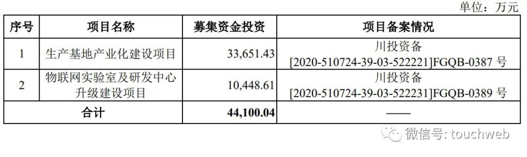爱联科技计划募资4.41亿元,其中,3.36亿元用于生产基地产业化建设项目,1.05亿元用于物联网实验室及研发中心升级建设项目。