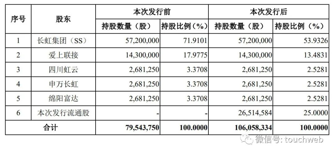 IPO后,长虹集团(SS)持股为53.9326%,爱上联接持股为13.4831%,四川虹云、申万长虹、绵阳富达分别持股为2.5281%。