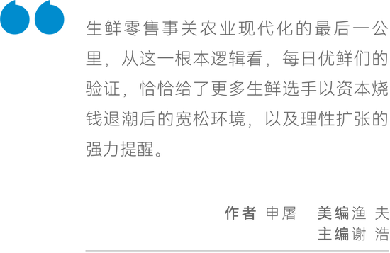老百姓总要吃菜,由于疫情等原因,也越来越愿意用手机买菜。而从社会角度看,生鲜零售事关农业现代化的最后一公里,是国家农业战略的重要组成部分。从这一根本逻辑看,每日优鲜们的验证,恰恰给了更多生鲜选手以资本烧钱退潮后的宽松环境,以及理性扩张的强力提醒。
