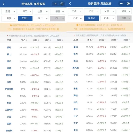 线下渠道萎缩,急需拓展线上渠道,是董明珠需要解决的问题。奥维罗盘数据显示,2021年,无论是线上还是线下,美的空调的销量均超越格力,位居第一。其中,美的空调的线上销量市场占有率为30.34%,格力为26.31%。美的空调线下的销量市场占有率为38.19%,格力同比下降1.13%,以30.21%的市场份额位于第二名。