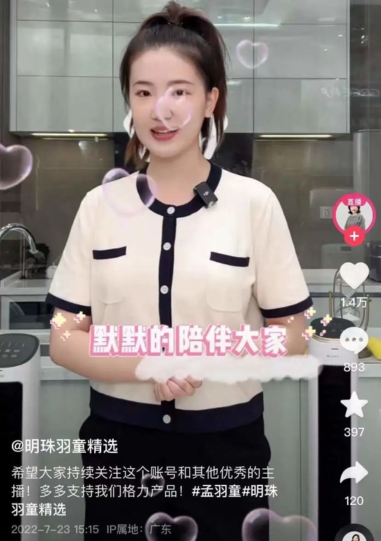 自6月开始,孟羽童在直播间出现的次数便明显减少。从“明珠羽童精选”抖音账号的直播截选视频内容看,5月,与孟羽童相关的视频尚有约15条;6月,相关视频减少到约6条,7月至今则已不见孟羽童身影。