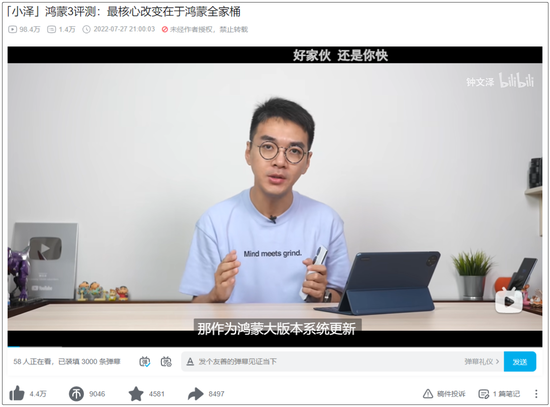 比如,钟文泽于2022年7月27日产出的鸿蒙3评测,在B站上已收获近百万次播放,超5000条评论。评论的主要内容,都是在讨论鸿蒙以及华为手机。这在某种程度上,已经承载了昔日手机论坛的绝大部分功能。