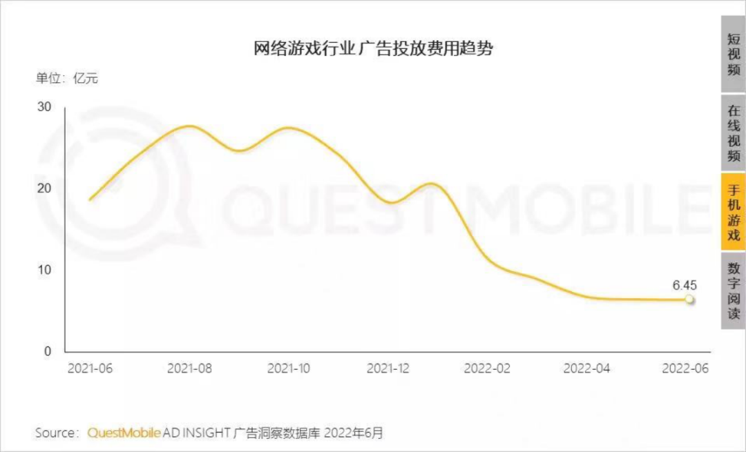 单就游戏类来看,根据 QuestMobile 统计,今年网络游戏行业广告投放费用趋势几乎可以说是急转直下。版号收紧,游戏公司全部转向出海,在国内市场的投放比例大幅降低。在互联网广告投放集体降速的前提下,最大金主降速,快手很难从其它行业找齐。