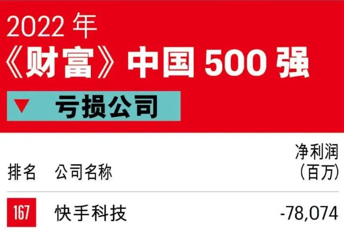 在今年 7 月中旬发布的《财富》中国 500 强榜单上,快手蝉联亏损王。2021 年,快手以 780.77亿成为亏损之王,上一年成绩是 1166 亿。