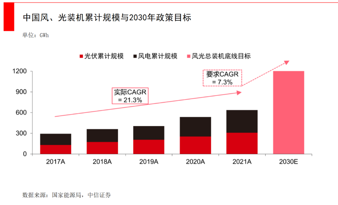 国内储能的大爆发,来源于政策变化。在碳中和、提升能源自给率的大背景下,国家能源局在《关于2021年风电、光伏发电开发建设有关事项的通知》中,计划2030年风电光伏装机总容量将达到12亿千瓦,而截至2020年底,风光总量不过6.3亿千瓦,这一目标意味着在未来10年中,风电与光伏要各新增3亿千瓦。