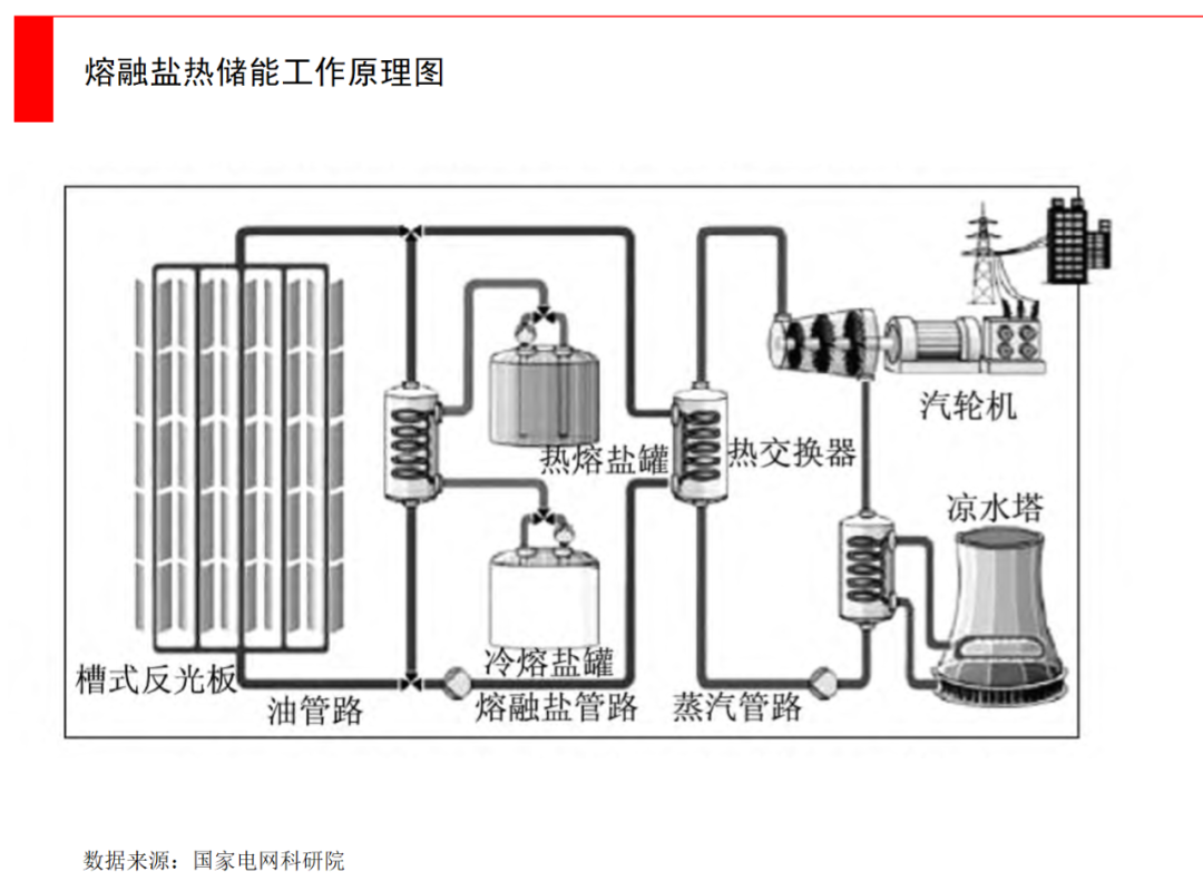 熔融盐储能:目前占比还很小。熔融盐是将盐升温到熔点之后,形成的一种熔融态液体,基本都是由无机盐构成的熔融体。工作原理是将多余电能,把熔盐的温度增至500 ℃,再存贮至高温熔盐罐中,到用电高峰再把高温熔盐从罐内取出,在熔盐换热器内实现热量转换来对水与空气进行加热,释放热能进行使用。与过去的高温导热介质相比,熔融盐的高温稳定性比较好。这种方式主要用于冬季供暖。
