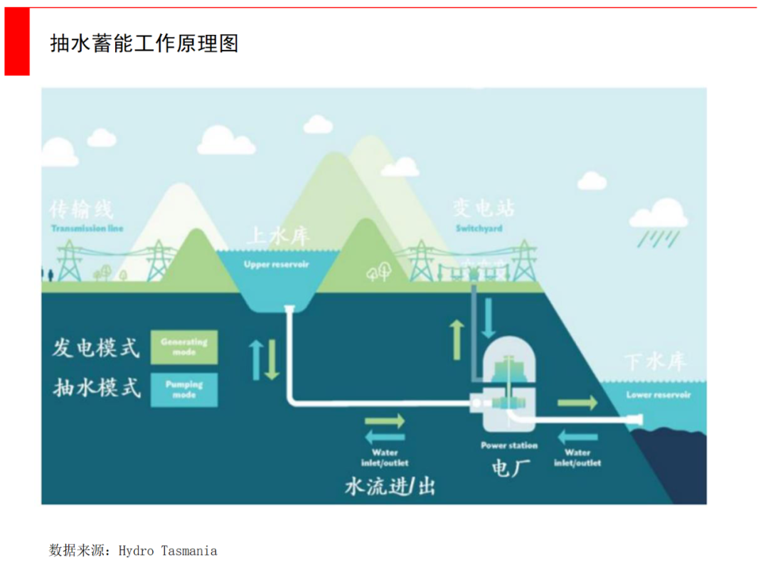 历史最为悠久、技术最为成熟的储能方式是抽水蓄能。它其实非常简单,就是把多余的电力输入抽水机组,利用水坝的高低差,把水从低位抽到高位。当需要用电时,再开闸放水发电。它所能储备的电量非常大。