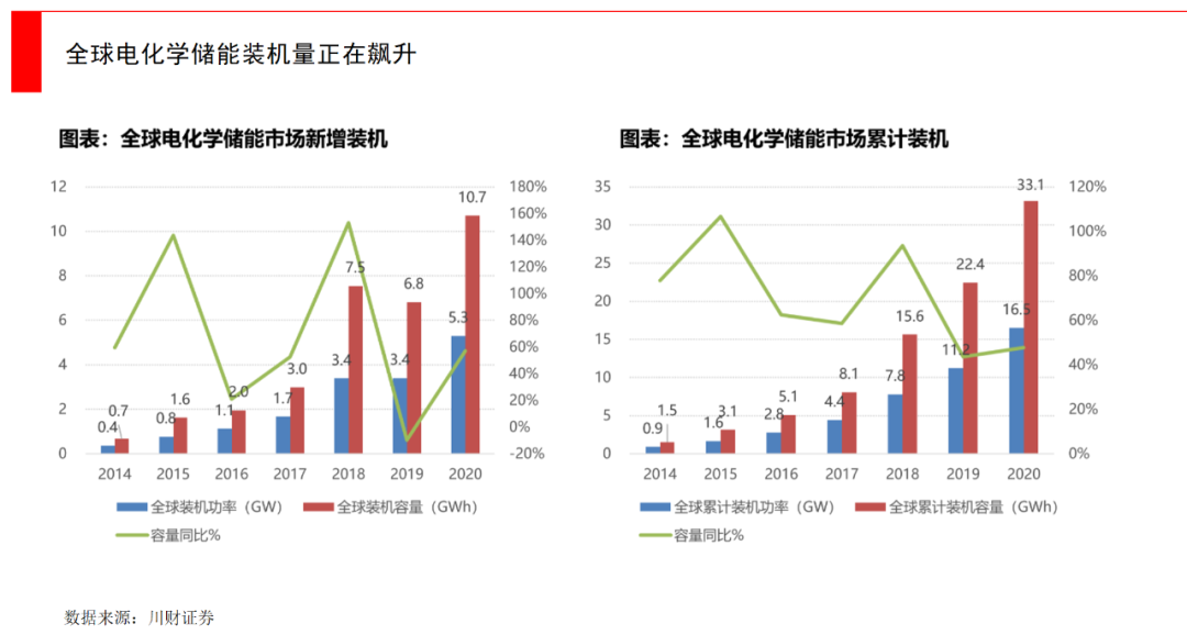在中国碳中和的大目标下,国家能源局给出了快速提升光伏、风电等清洁能源的计划,这就要求大规模、系统性的储能配套。目前全球最多的传统储能手段就是抽水蓄能,而在新型储能里,电化学储能增速惊人。