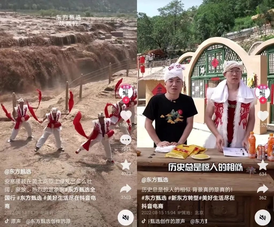 值得一提的是,东方甄选还在直播间里引入非遗文化的现场表演,安塞腰鼓、黄河老腔、当地的特色民俗内容,实现了文化、讲解、销售的三位一体价值,将内容直播发挥到了极致。