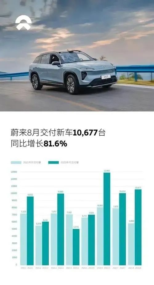 8月份,蔚来汽车2022款ES8、ES6、EC6、ES7陆续开启交付,智能电动轿跑蔚来ET5也将在9月30日开启交付。