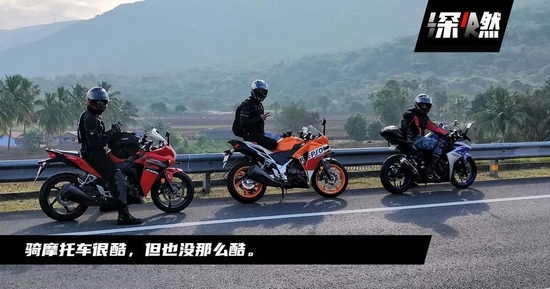 其实,在众多骑手的体会和观察中,他们也认为,骑摩托车并不是一件完全体面和潇洒的事情,很多人因为一时兴起而入坑,但最后都受不了苦而作罢。真正的爱好者,也要忍着头盔的闷热和发动机的高温,趁着等红绿灯的间隙换空挡。逢刮风下雨的天气,戴着头盔看似波澜不惊的骑手,心里想的却是:我能不能不骑车,坐旁边那辆公交车?