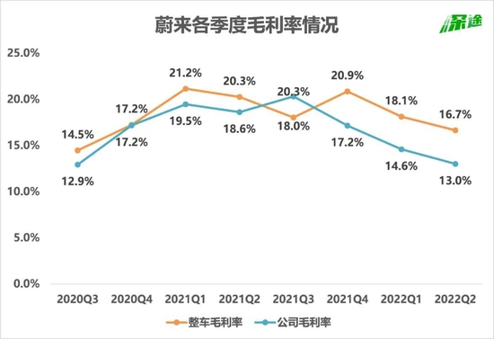第二个目标是财务上的。蔚来2022年汽车销售毛利率目标是18%-20%。去年蔚来的成绩是20.1%,今年一季度是18.1%,二季度降到16.7%。如果要完成全年目标,三季度和四季度必须把毛利率提上去。