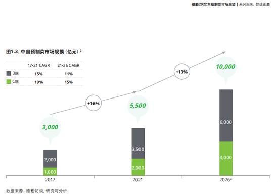 德勤中国发布的《2022年预制菜市场展望》显示,2021年,中国预制菜市场规模约为5500亿元,未来五年复合年均增长率预计为13%,2026年,相关市场规模有望突破万亿元。
