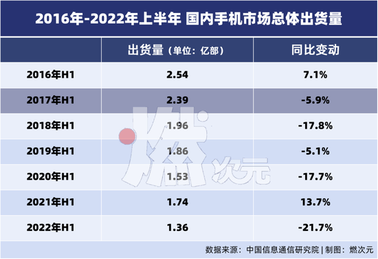 调研机构CINNO的数据则为,2022年上半年中国市场智能机销量约1.34亿部,同比下降16.9%。CINNO直言,“(这是)2015年以来最差的上半年销量成绩。”