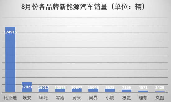 埃安今年的市场表现不错,8月销量2.7万辆,较去年增长133%,排在新能源汽车销量榜第二,它前面是一骑绝尘的比亚迪。