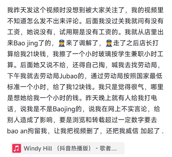 对此愤愤不平的小苏,从优衣库门店离开后,立刻报了警,并将此事反映给了有关部门。在有关部门的调解下,优衣库店长按照最低工资标准,给了小苏12元的小时工资。