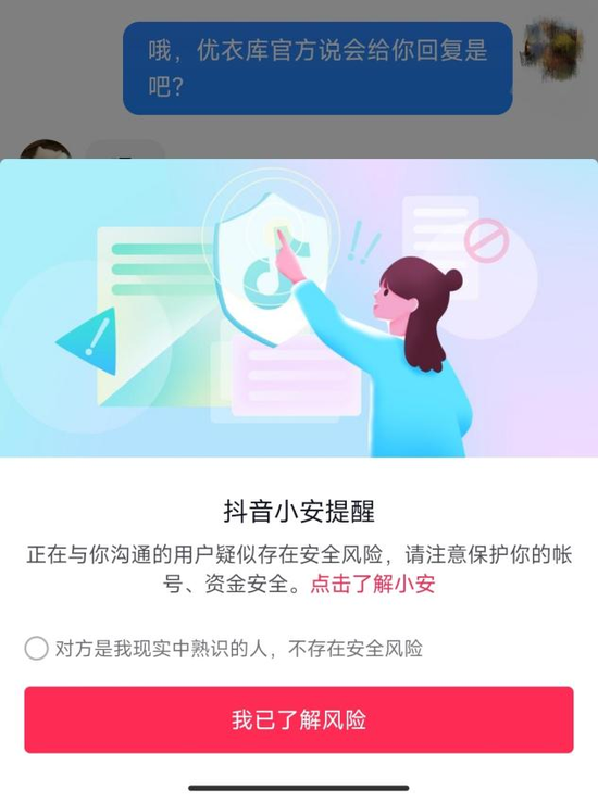 小苏向潘哥表示,优衣库官方曾表示会给小苏回复,但是几天过去了,对方却一直没有回复自己。同时,潘哥也发现,自己与小苏的抖音对话框,出现了风险提示,这证明小苏的抖音账号,已经被人举报了。