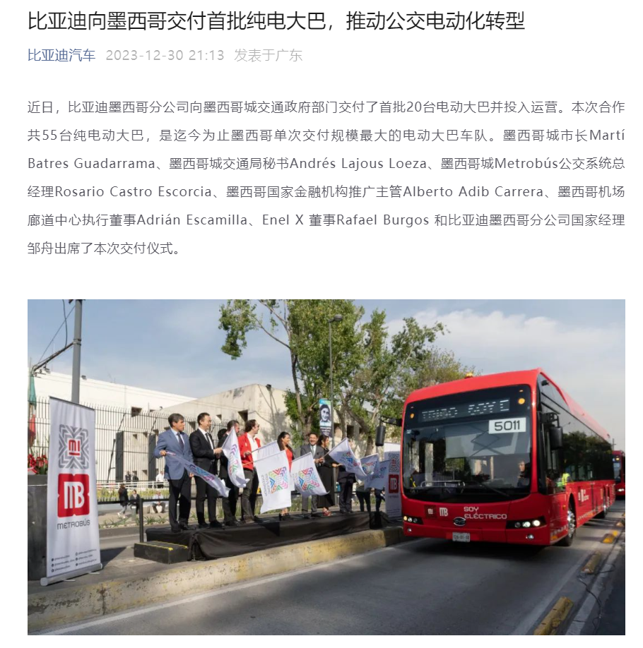 IT之家 12 月 30 日消息,比亚迪墨西哥分公司向墨西哥城交通政府部门交付了首批 20 台电动大巴并投入运营。本次合作共 55 台纯电动大巴,是迄今为止墨西哥单次交付规模最大的电动大巴车队。