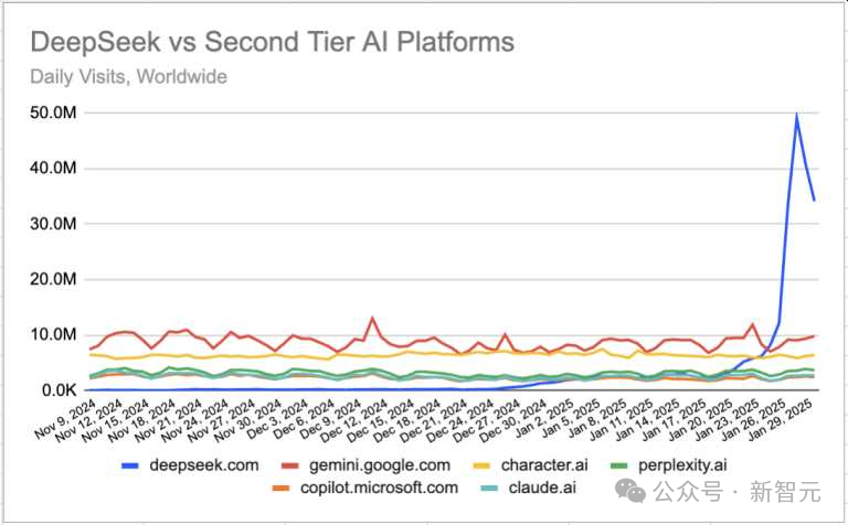 一个月前,DeepSeek 网站平均每天的访问量才只有 30 万次,但到了 1 月 27 日,这个数字飙升至 3340 万,增长了 100 多倍!