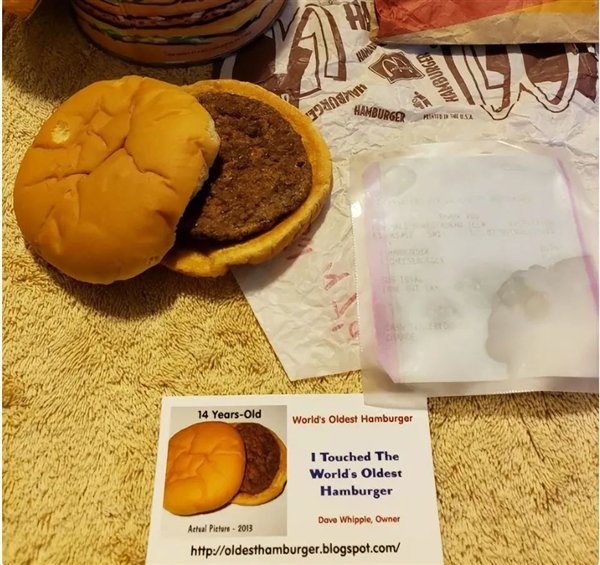 2013年的时候(汉堡14岁),戴夫给汉堡投了100万美元,然后将这个汉堡邮寄到一个电视节目中,来揭秘其不腐的奥秘。