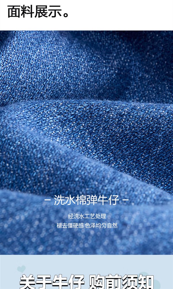 浅蓝、中蓝、深蓝三色可选。中腰设计,穿着舒适不勒腰,适合日常穿着。