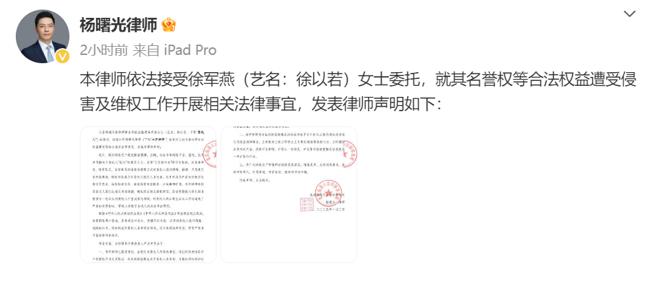 律师声明称:“徐军燕(艺名:徐以若)女士‘殴打’赵露思女士、索要‘天价解约金’为不实信息。”
