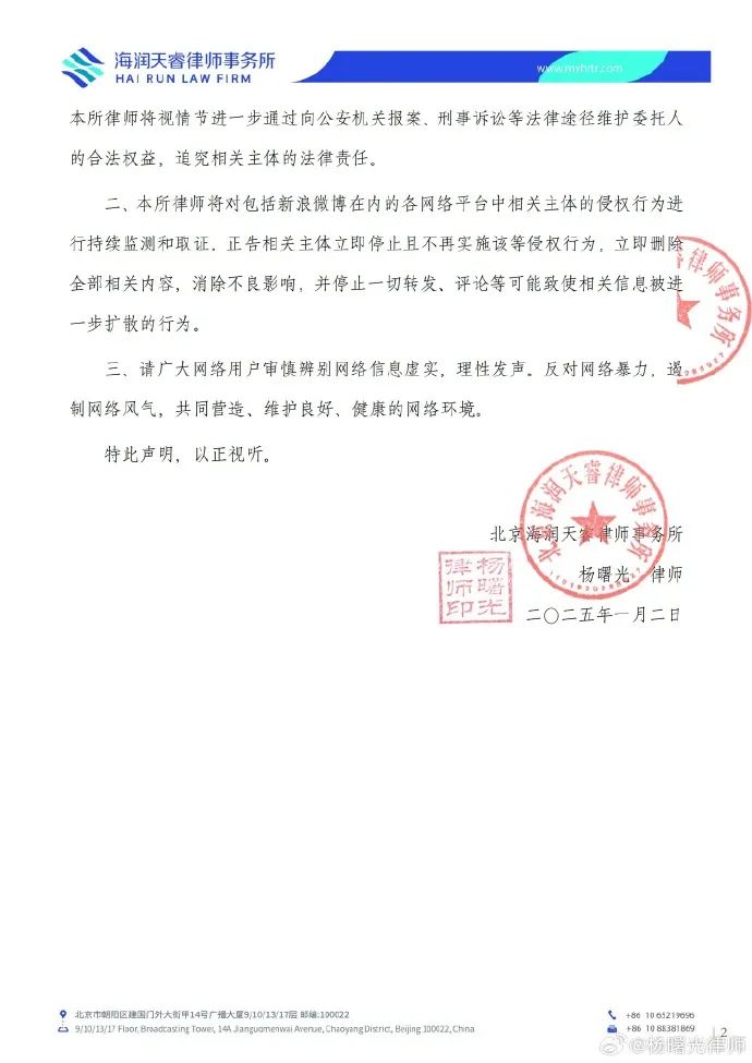 此外,还有网友认为“殴打”赵露思当事人为其前经纪人徐以若。对此,徐以若方发律师函否认殴打赵露思。1月2日,杨曙光律师发布律师声明称:“本律师依法接受徐军燕(艺名:徐以若)女士委托,就其名誉权等合法权益遭受侵害及维权工作开展相关法律事宜。”