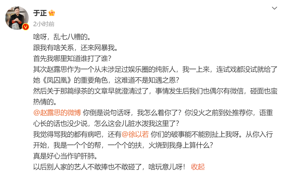于正也发文回应与赵露思相关传闻。他表示,热议话题跟自己无关,不知道谁打了谁,当年试戏都没试就让纯新人的赵露思出演了《凤求凰》,有关“绿茶”的文章也已经澄清,事后两人碰面也蛮热情,“火烧到我身上算什么?”
