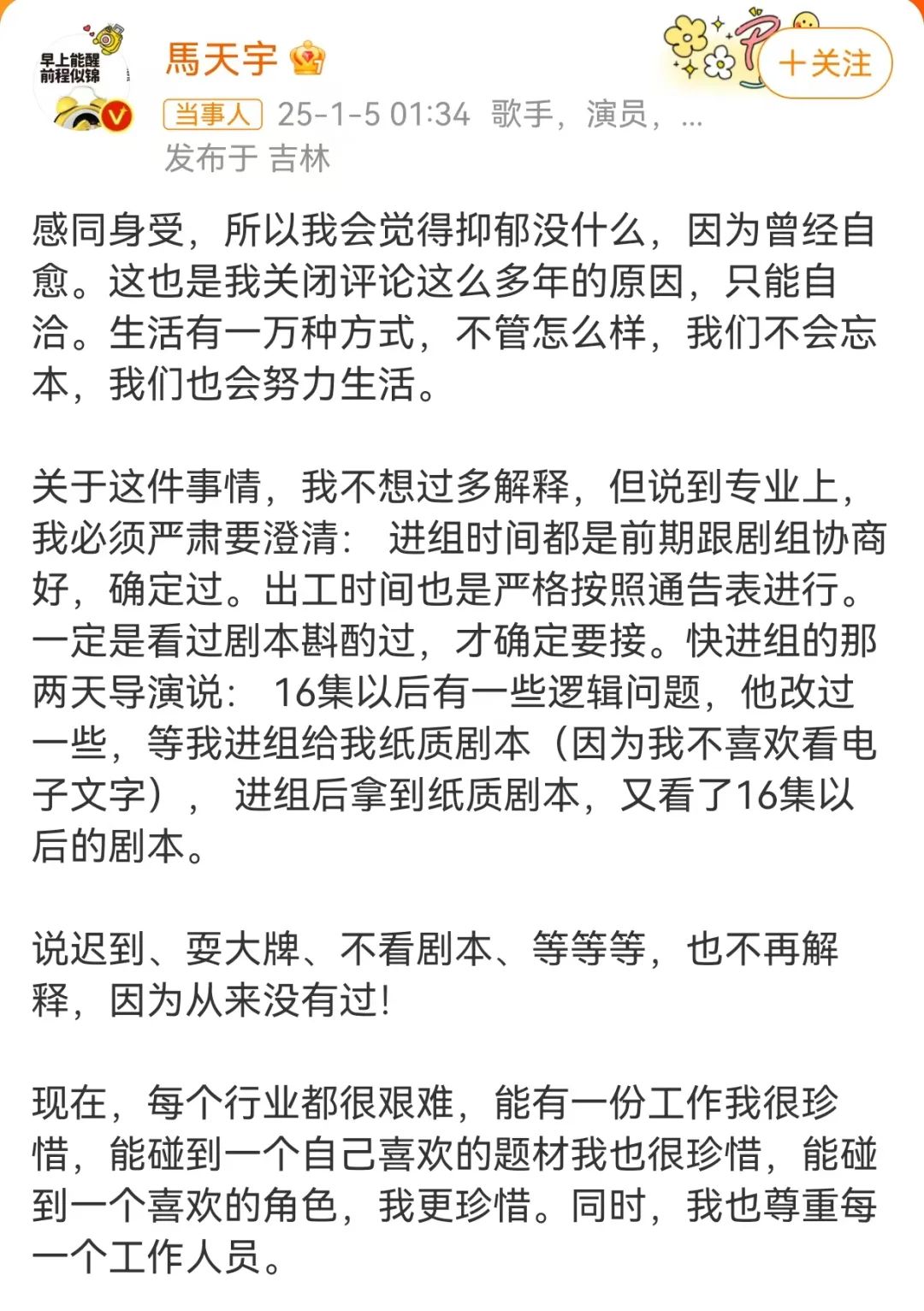 马天宇回应冲上热搜第一。