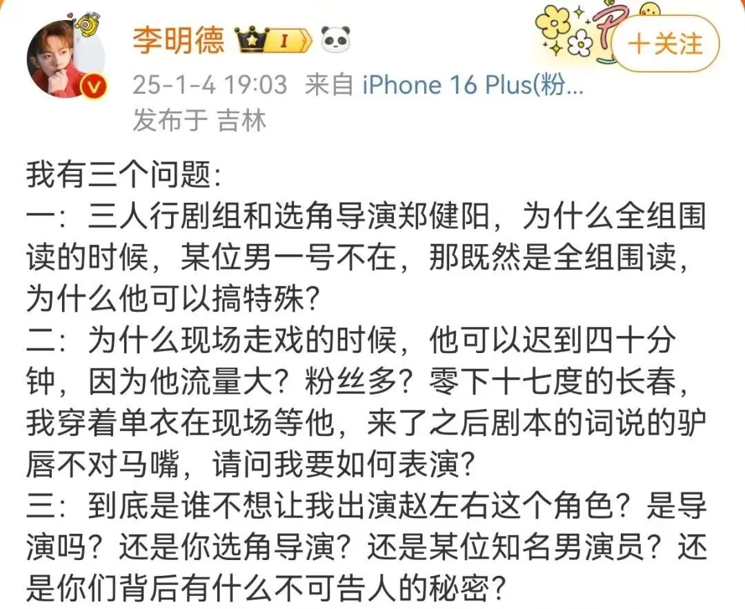 李明德发文向电视剧《三人行》剧组提出三个疑问,称全组围读男一号缺席,主演耍大牌,现场走戏,他穿着单衣在零下十七摄氏度的长春等了40分钟,来了后男主角的台词却说得驴唇不对马嘴,他进组后被踢,疑似理由却是他“耍大牌”。