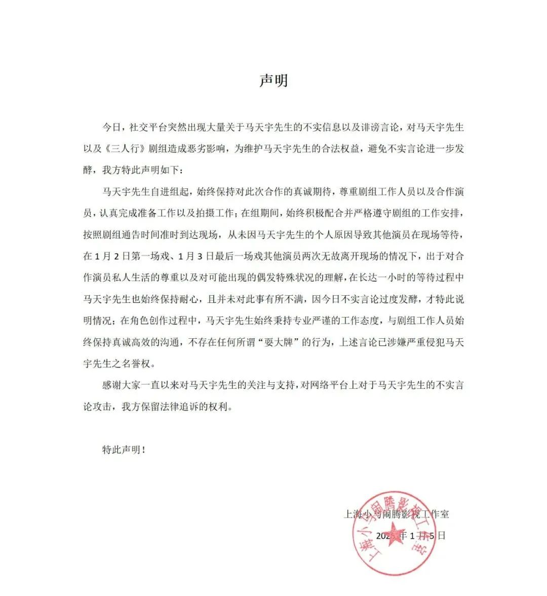马天宇工作室发声明称,