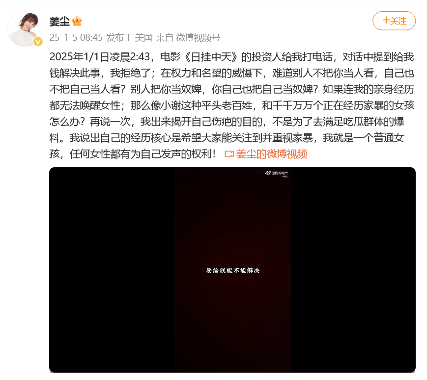 1月5日,姜尘再次发视频,她发布与电影《日掛中天》投资人的通话录音,正式点名指控张颂文涉嫌家暴。录音中,这位投资人试图用金钱解决问题,但姜尘表示她不需要钱,而是希望引起大家对家暴的关注。“我出来揭开自己伤疤的目的,不是为了去满足吃瓜群体的爆料。我说出自己的经历核心是希望大家能关注到并重视家暴。”
