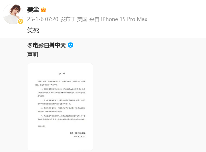 6日早上,姜尘转发这则声明回应:“笑死。”