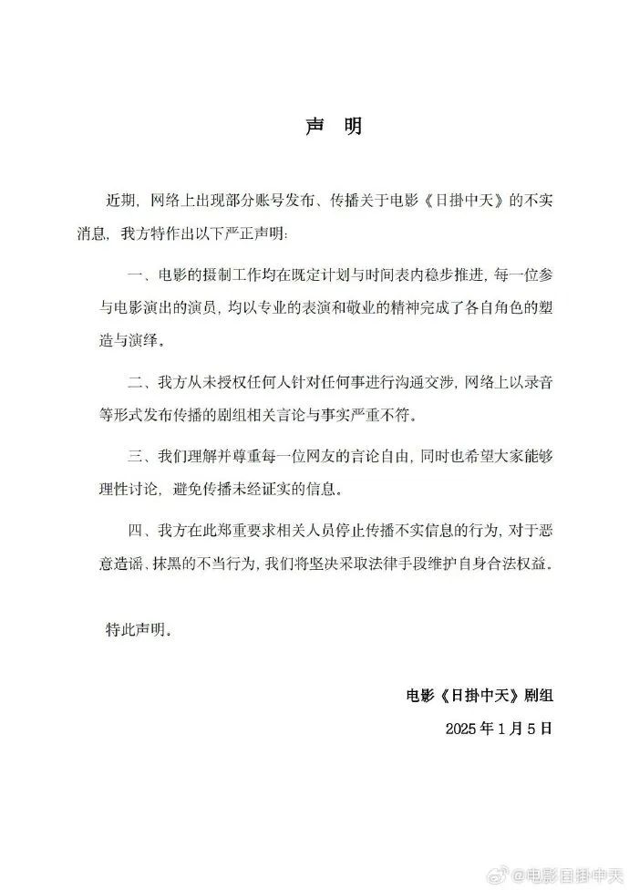 5日晚,电影《日掛中天》官博发声明:我方从未授权任何人针对任何事进行沟通交涉,网络上以录音等形式发布传播的剧组相关言论与事实严重不符。