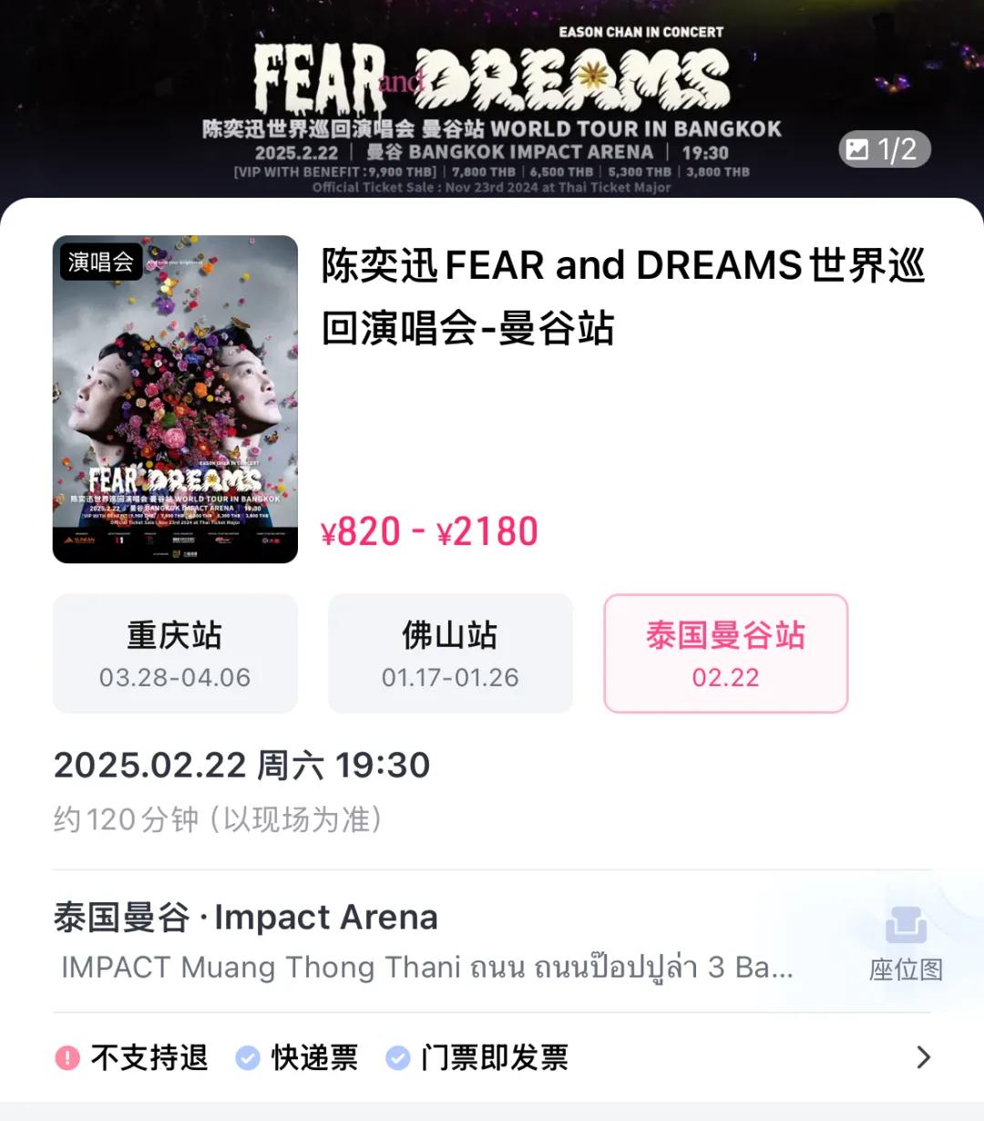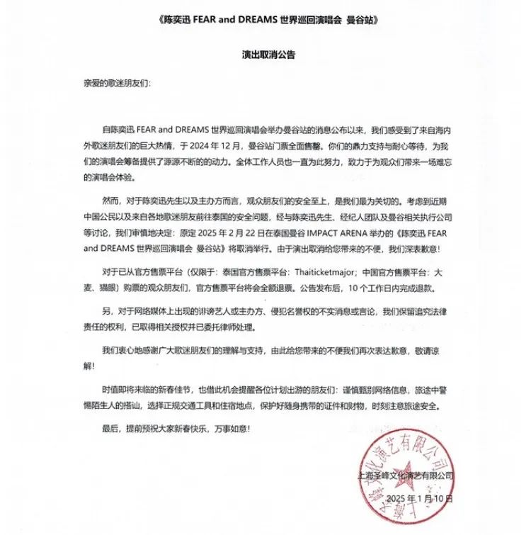 1月10日,来自@圣峰演艺微博消息:考虑到近期中国公民以及来自各地歌迷朋友前往泰国的安全问题,经与陈奕迅先生、经纪人团队及曼谷相关执行公司等讨论,审慎地决定:原定2025年2月22日在泰国曼谷IMPACTARENA举办的《陈奕迅 FEARand DREAMS 世界巡回演唱会 曼谷站》将取消举行。对于已从官方售票平台(仅限于:泰国官方售票平台:Thaiticketmajor;中国官方售票平台:大麦、猫眼)购票的观众朋友们,官方售票平台将会全额退票。公告发布后,10个工作日内完成退款。