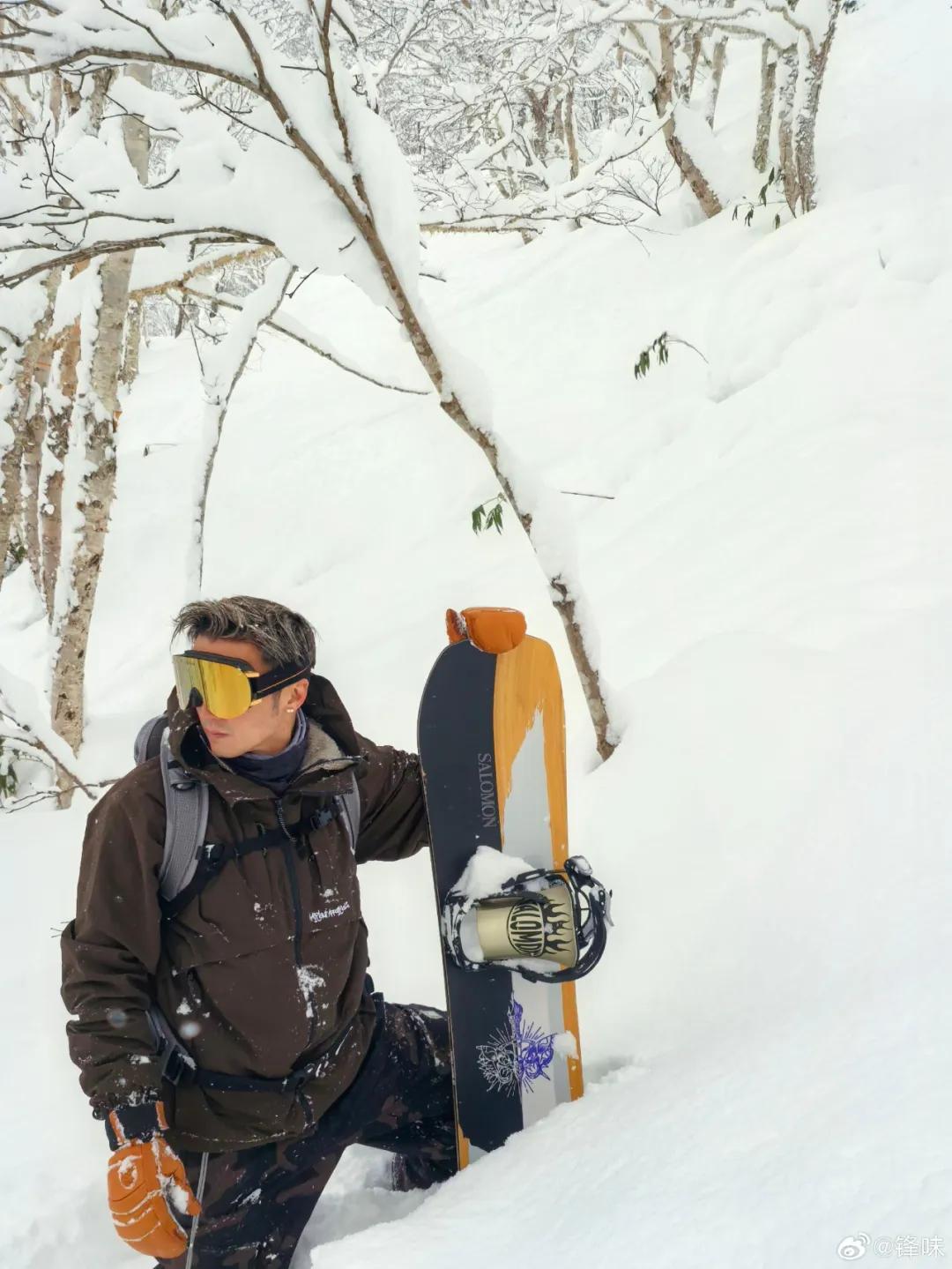 照片中,谢霆锋手拿滑雪板,戴着护目镜,全副武装行走在雪地中,依然难掩帅气,儿子Lucas同样装备齐全,在雪地里摆出帅气的拍照姿势。
