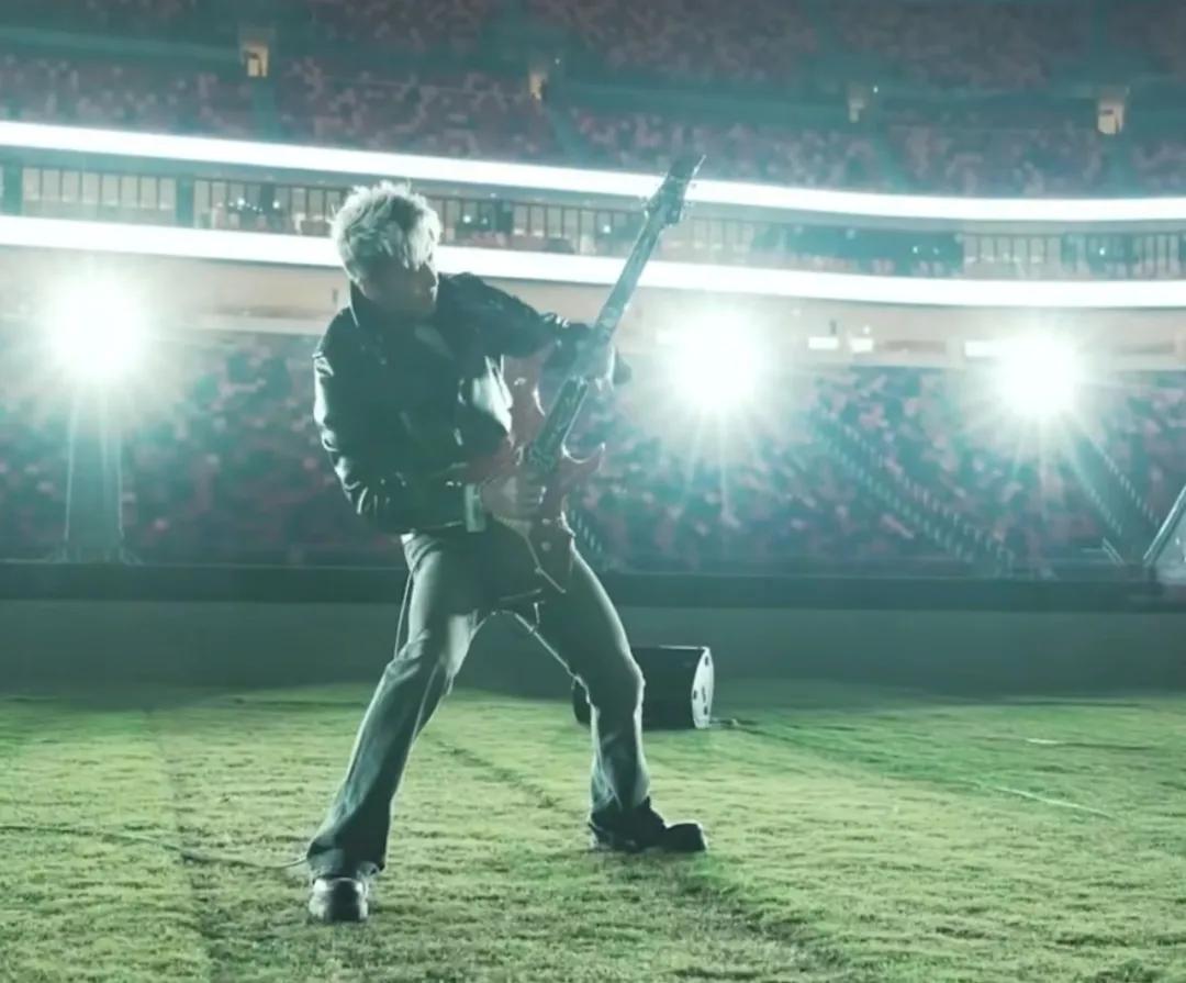 视频里,谢霆锋在场馆里弹着吉他,吉他上还印有一个“锋”字。