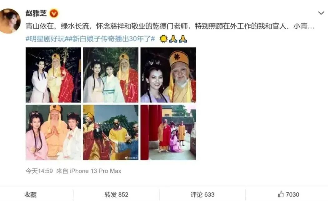 2022年11月5日,《新白娘子传奇》播出30周年,“白娘子”赵雅芝晒出一组图纪念,引发一波回忆杀。“青山依在、绿水长流,怀念慈祥和敬业的乾德门老师,特别照顾在外工作的我和官人、小青……”