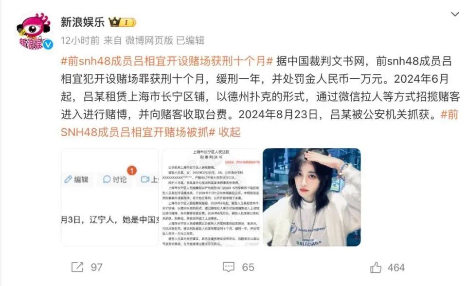 据中国裁判文书网,前SNH48成员吕相宜犯开设赌场罪获刑十个月,缓刑一年,并处罚金人民币一万元。