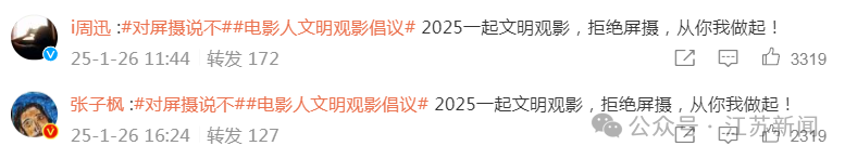 1月26日,微博电影联合50位电影人共同发起2025文明观影倡议,希望在新的一年一起营造更沉浸的观影氛围。文明观影从你我做起,对屏摄说“不”!