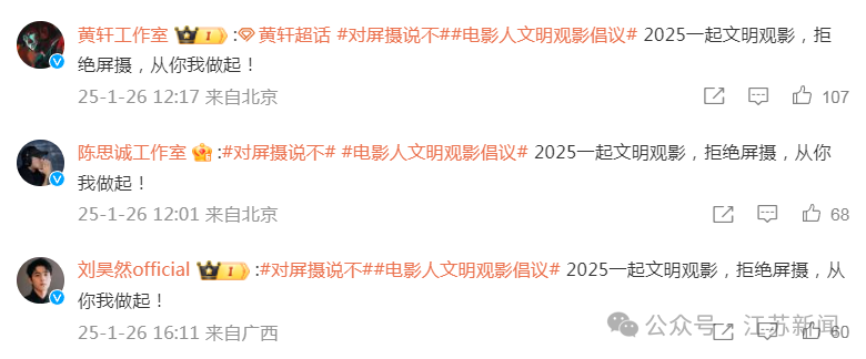 随后,黄轩、陈思诚、刘昊然、周迅、张子枫等方面也转发回应:“2025一起文明观影,拒绝屏摄,从你我做起!”