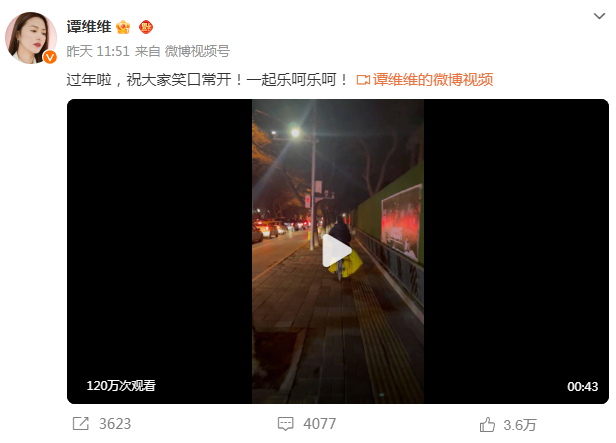 谭维维写道:“过年啦,祝大家笑口常开!一起乐呵乐呵!”