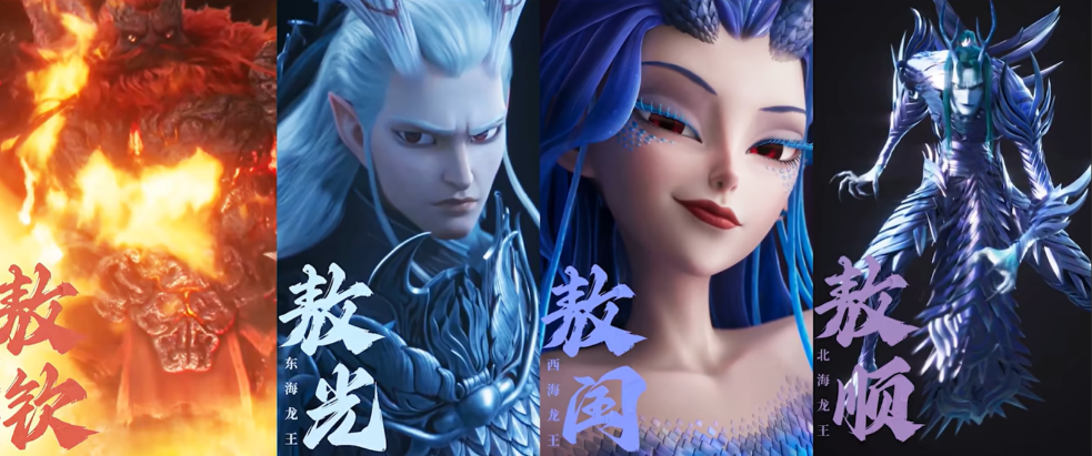 四海龙王在《哪吒1》里小露一脸,黑灯瞎火的海底龙宫监狱看也看不太清,这回总算1080P登场。为了让四条龙不会互相混淆,导演也是想尽办法给设定了各自的系别——东海龙王敖光随他儿敖丙,是冰系的,武器是水刀和水龙;北海龙王敖顺阴险狡诈,所以全身长满刀片,身体各个关节都可以灵活变动(刀);南海龙王敖钦是火系,打起来像坦克发动;西海龙王敖闰是四海龙王中唯一的女性,主打妖娆鬼魅,兵器“裂空爪”可以隔空取物厉害得很。