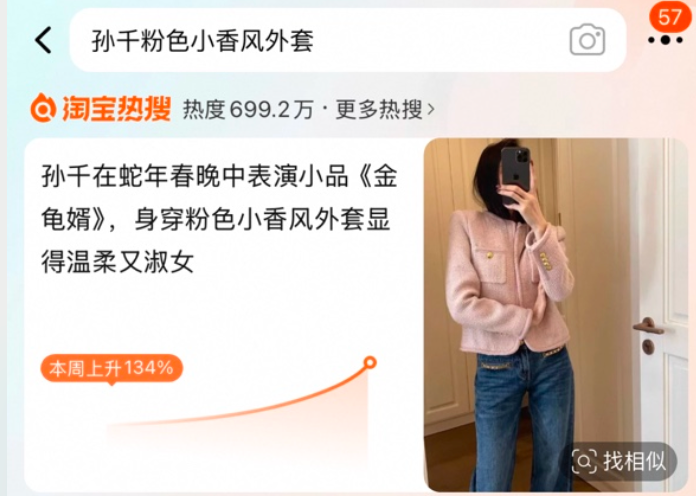 根据淘宝当晚热搜榜单,《金龟婿》一个节目不仅带火了马丽春晚同款亮片毛衣,马丽同款尖头短靴、喝的白啤、沈腾同款休闲板鞋等商品也快速被网友搜上了。