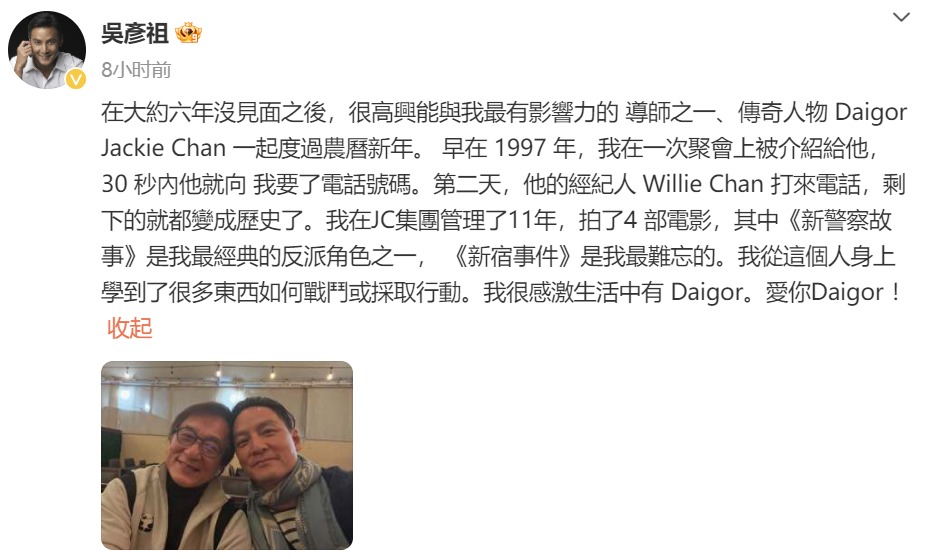 2月1日,吴彦祖在微博晒出与成龙的合照并发文表示,六年没见面,很高兴能与最有影响力的导师之一、传奇人物Daigor Jackie Chan 一起度过农历新年。同时,他还回忆了自己与成龙合作的电影《新警察故事》《新宿事件》。