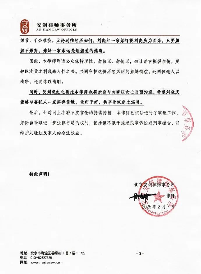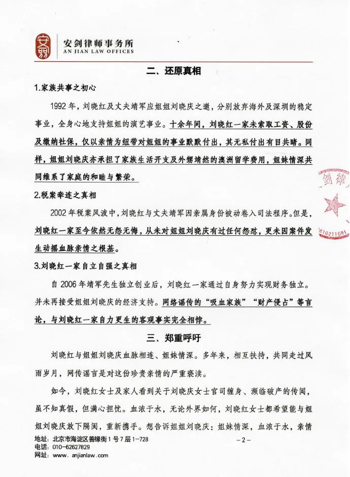 7日中午1时许,刘晓红、靖军夫妇的代理律师周兆成也发布了律师声明。声明中,对家庭经济、财产和税务等方面的谣言进行了澄清,并表示网络传言是对亲情的亵渎。针对网上各种不实言论的持续传播,也已依法进行了取证工作。