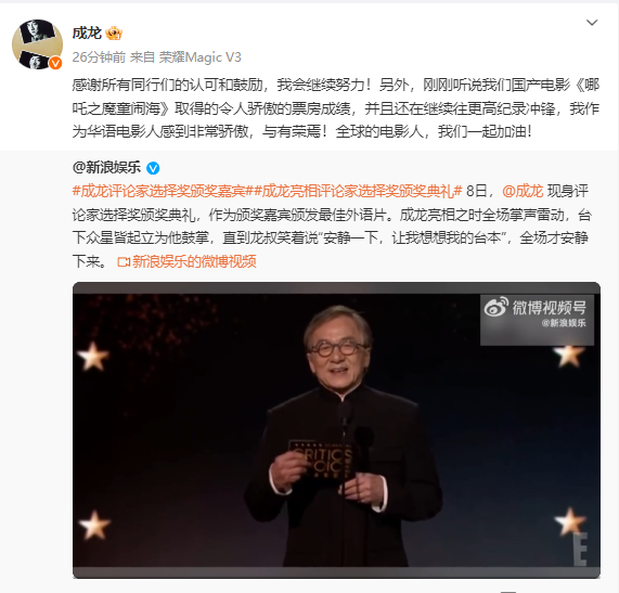 刚刚,成龙发文:感谢所有同行们的认可和鼓励,我会继续努力!另外,刚刚听说我们国产电影《哪吒之魔童闹海》取得的令人骄傲的票房成绩,并且还在继续往更高纪录冲锋,我作为华语电影人感到非常骄傲,与有荣焉!全球的电影人,我们一起加油!