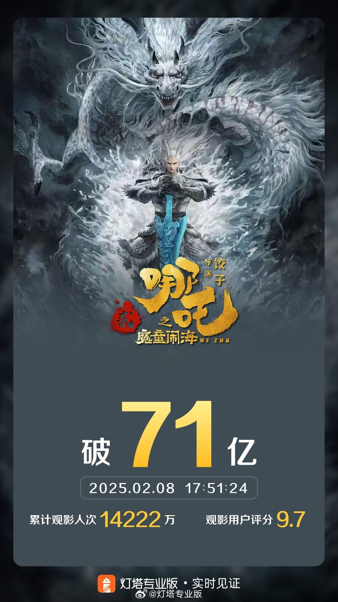 据灯塔专业版实时数据,截至2月8日17时51分,影片《哪吒之魔童闹海》票房突破71亿。