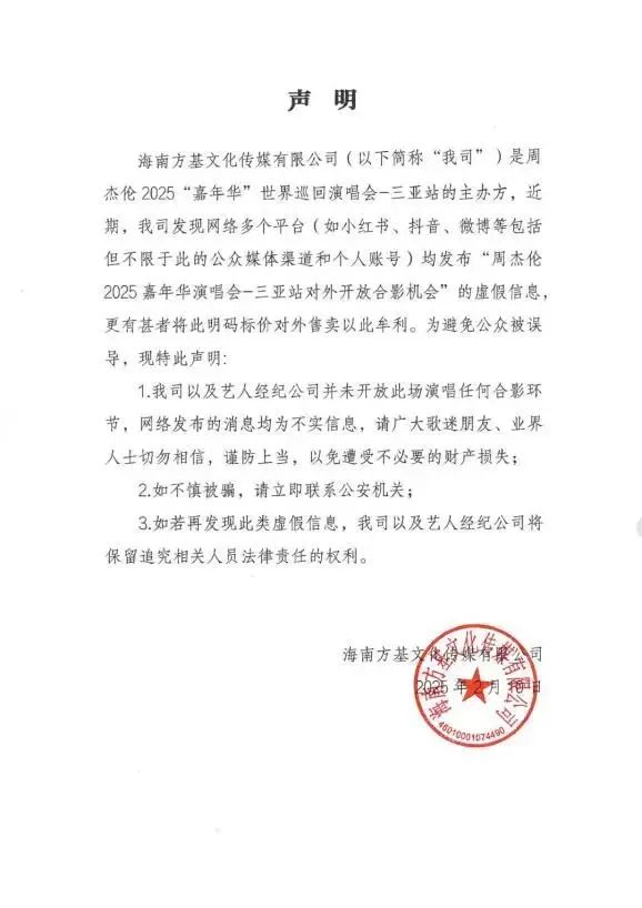 海南方基文化传媒有限公司(以下简称“我司”)是周杰伦 2025“嘉年华”世界巡回演唱会-三亚站的主办方,近期,我司发现网络多个平台(如小红书、抖音、微博等包括但不限于此的公众媒体渠道和个人账号)均发布“周杰伦2025嘉年华演唱会-三亚站对外开放合影机会”的虚假信息,更有甚者将此明码标价对外售卖以此牟利。为避免公众被误导,现特此声明: