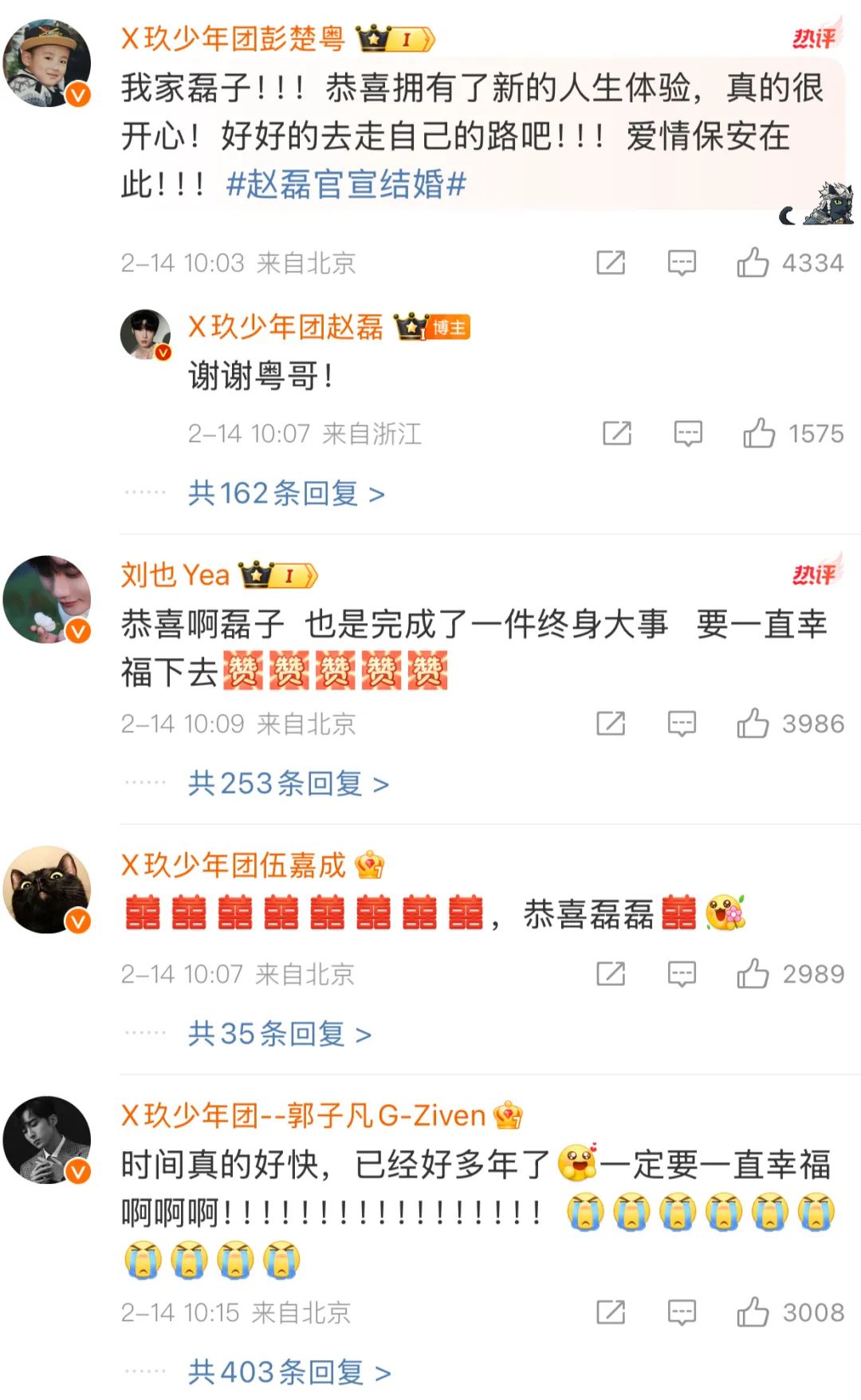 赵磊官宣微博的评论区,同团成员和其圈内好友排队送祝福: